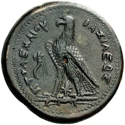 “The Ptolomaic coins from 246–222 BCE show the Chi-Rho symbol between the legs of an eagle with closed wings, who stands on a bolt of lightining, next to a horn of plenty. The imagery on the obverse side of the coin always shows Zeus-Amun. The imagery and context of the symbol is decidedly Greek.”